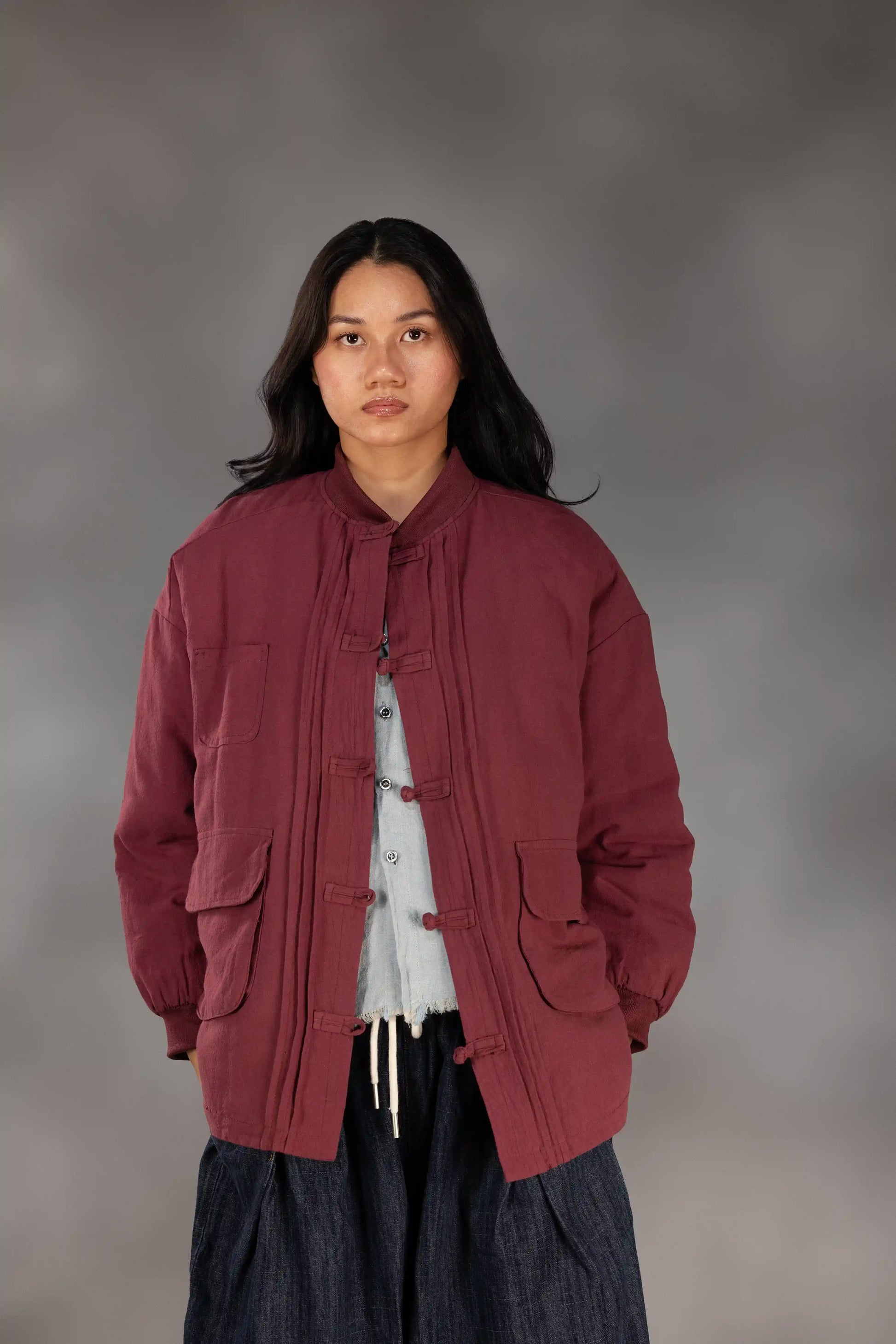 A quilted jacket in deep claret, blending retro Chinese inspiration with quiet modernity. Crafted with a cotton-silk blend shell and cotton filling, it offers warmth, texture, and timeless layering appeal.