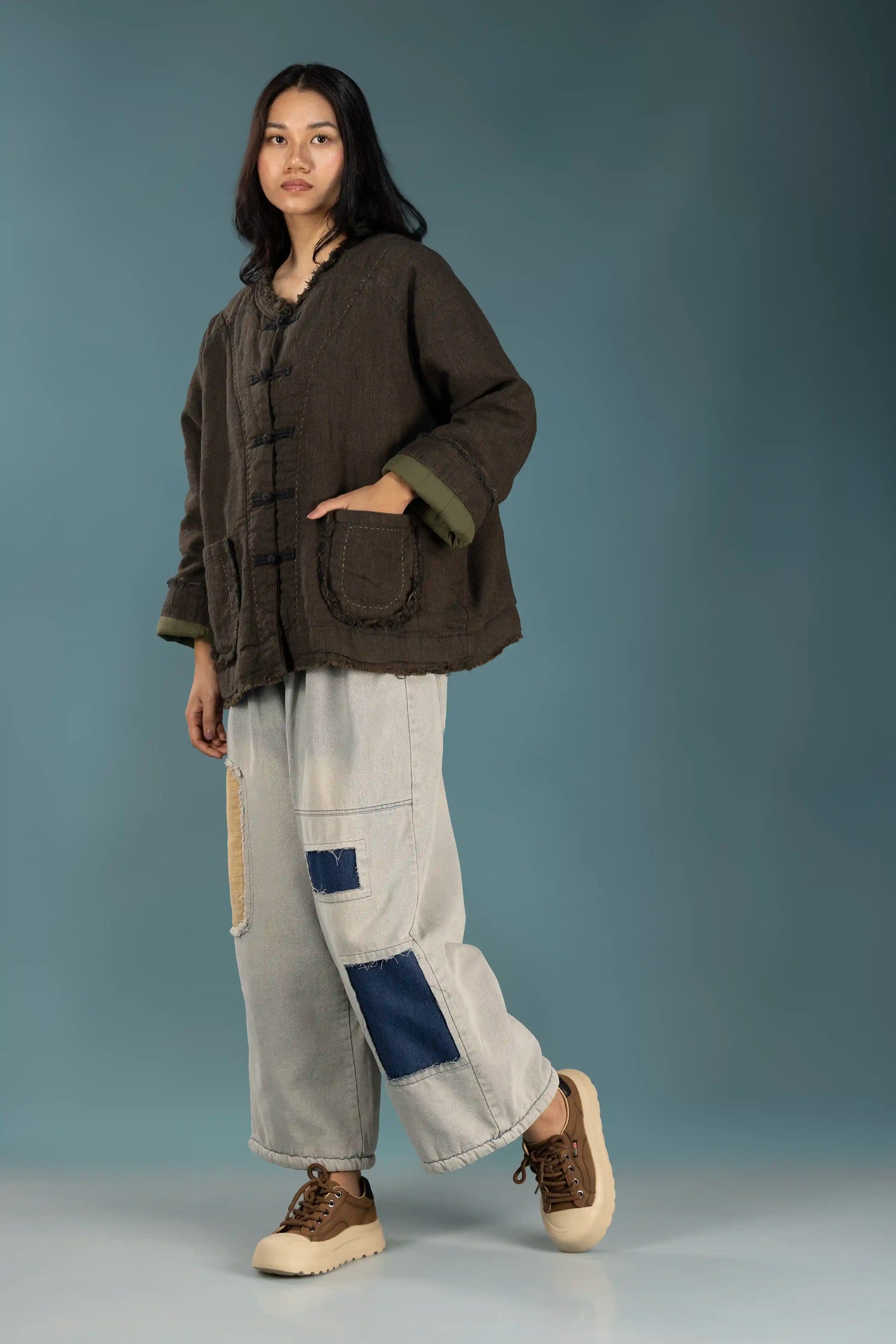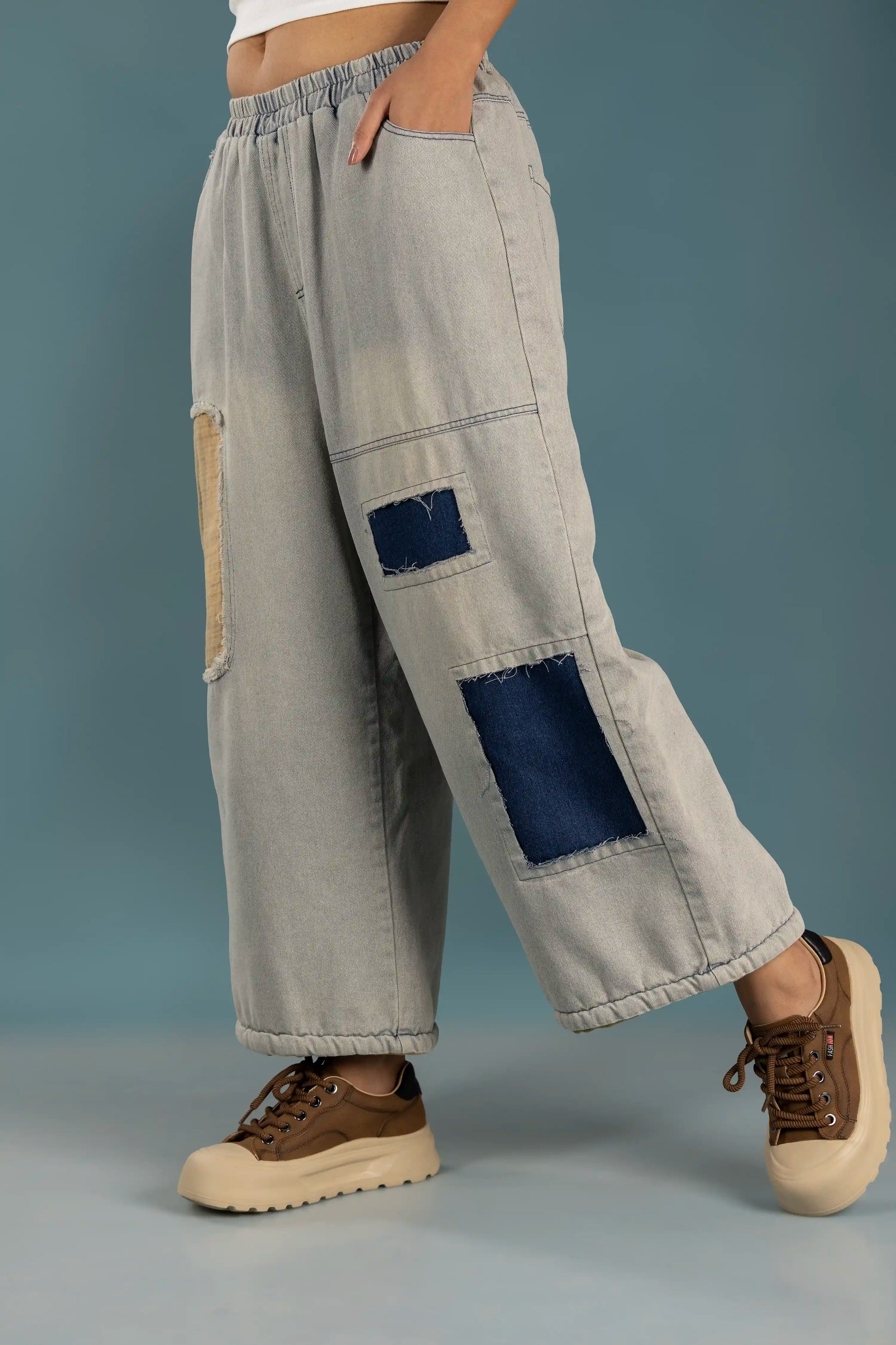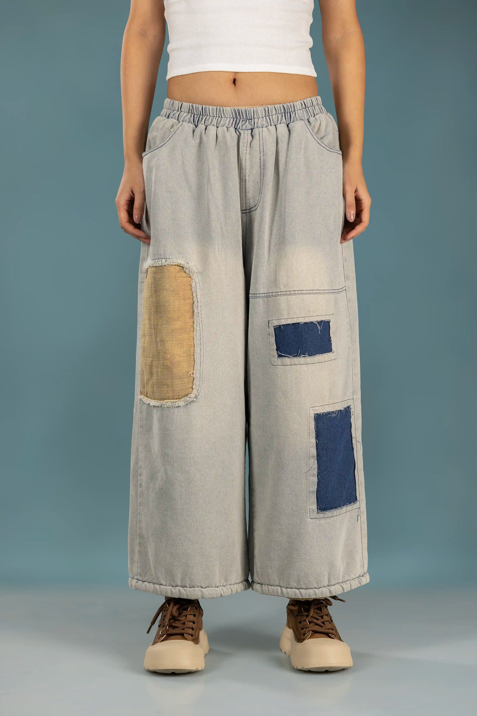 Relaxed denim with cotton lining and contrast patchwork. A lived-in, retro silhouette for effortless everyday ease.