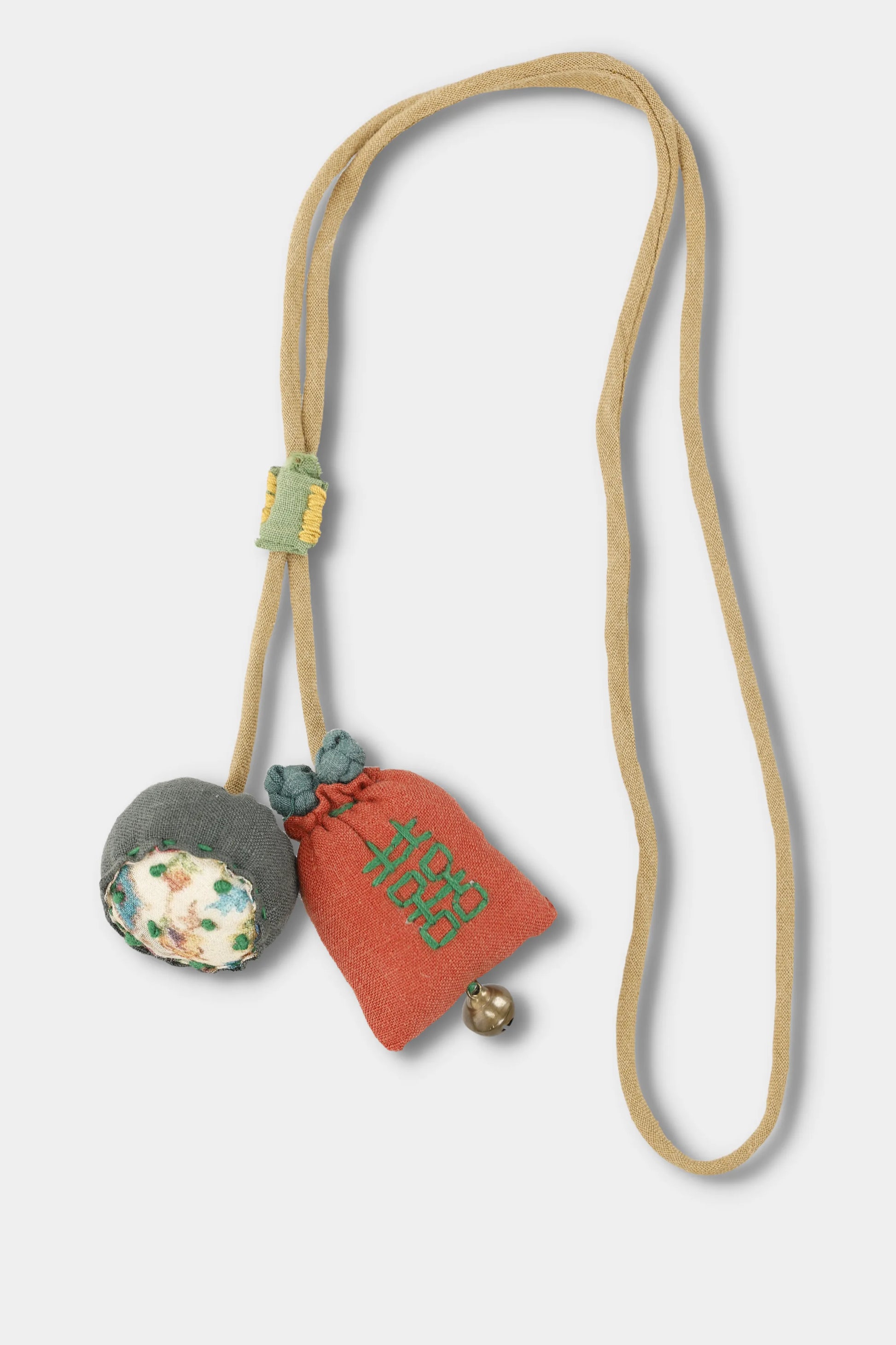 Handmade linen-cord necklace with lotus pod charms and a tiny bell, an earthy, playful accent for layering.