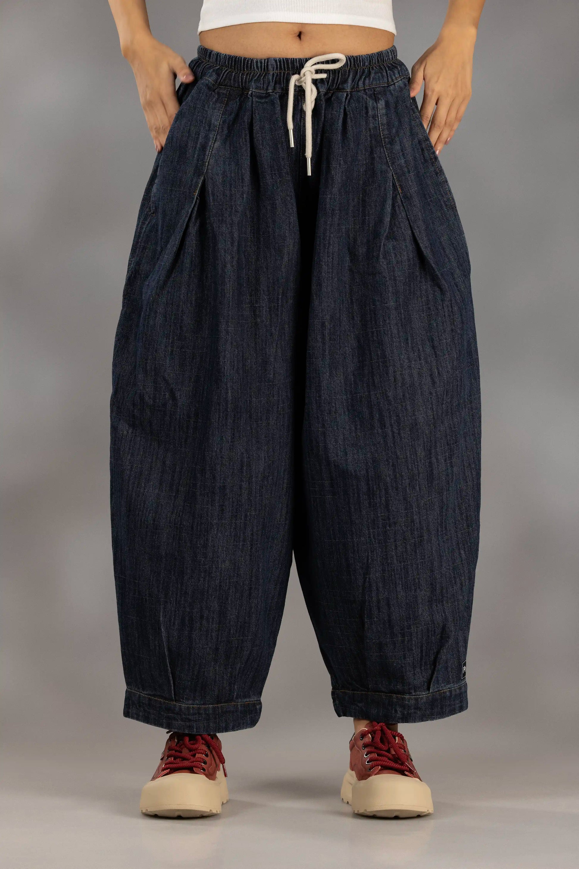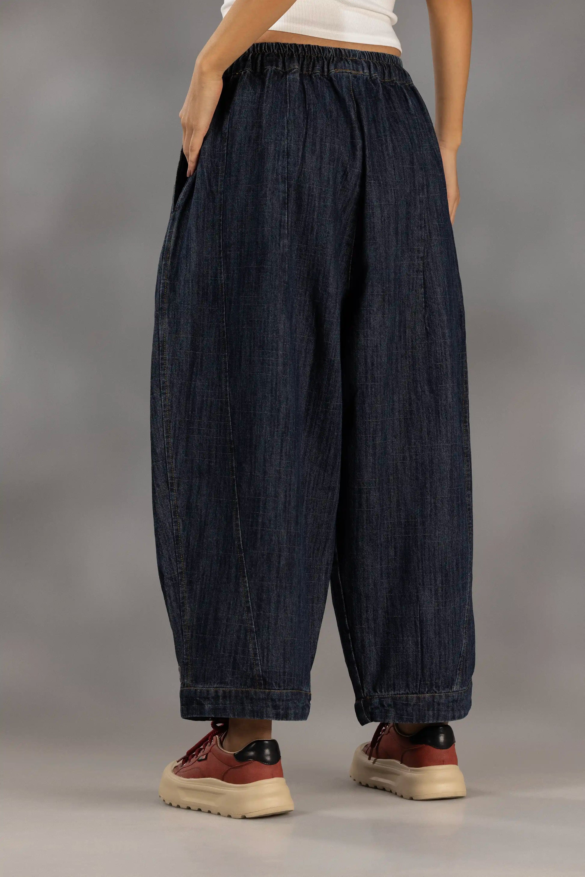Roomy, easy denim in a deep indigo wash with an elastic waist, soft drape, and cropped hem. Effortless for everyday layers.