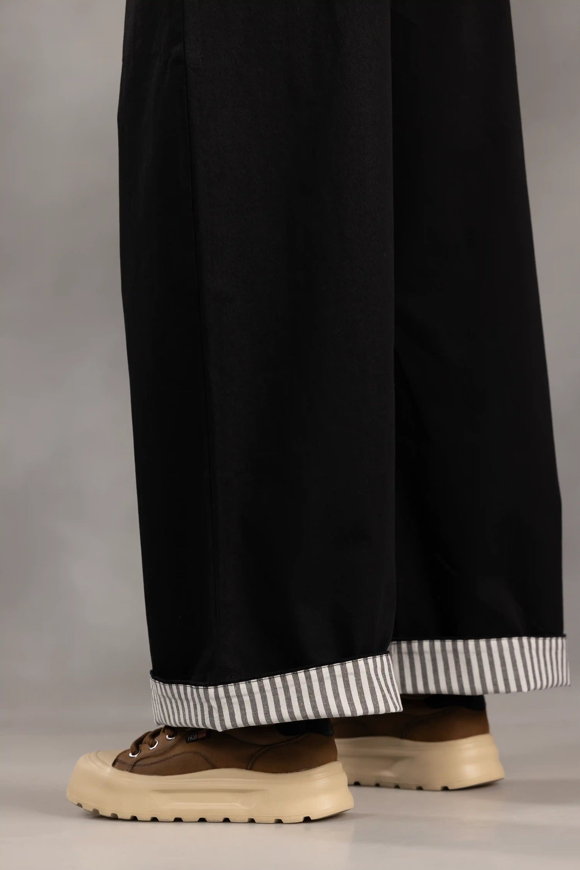 Relaxed black wide-leg pants with striped fold-up cuffs, balancing ease and refinement for everyday wear.