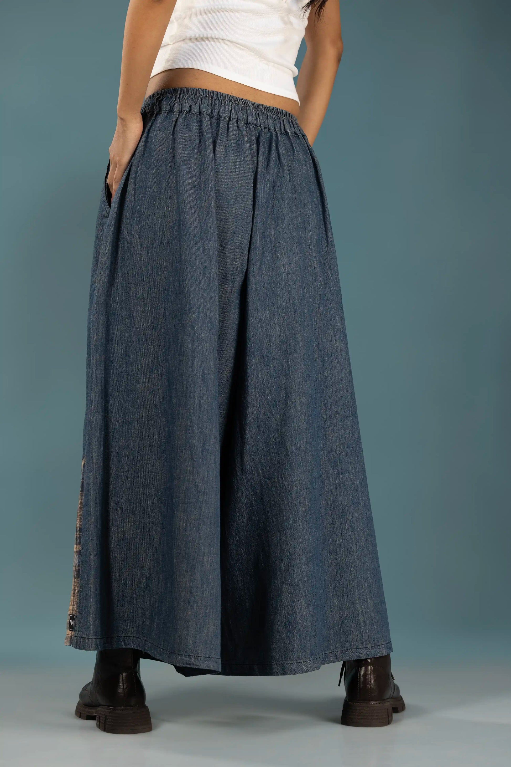 Soft denim wide-legs with contrast plaid panels, elastic drawstring waist, and pockets-easy movement, instant statement.