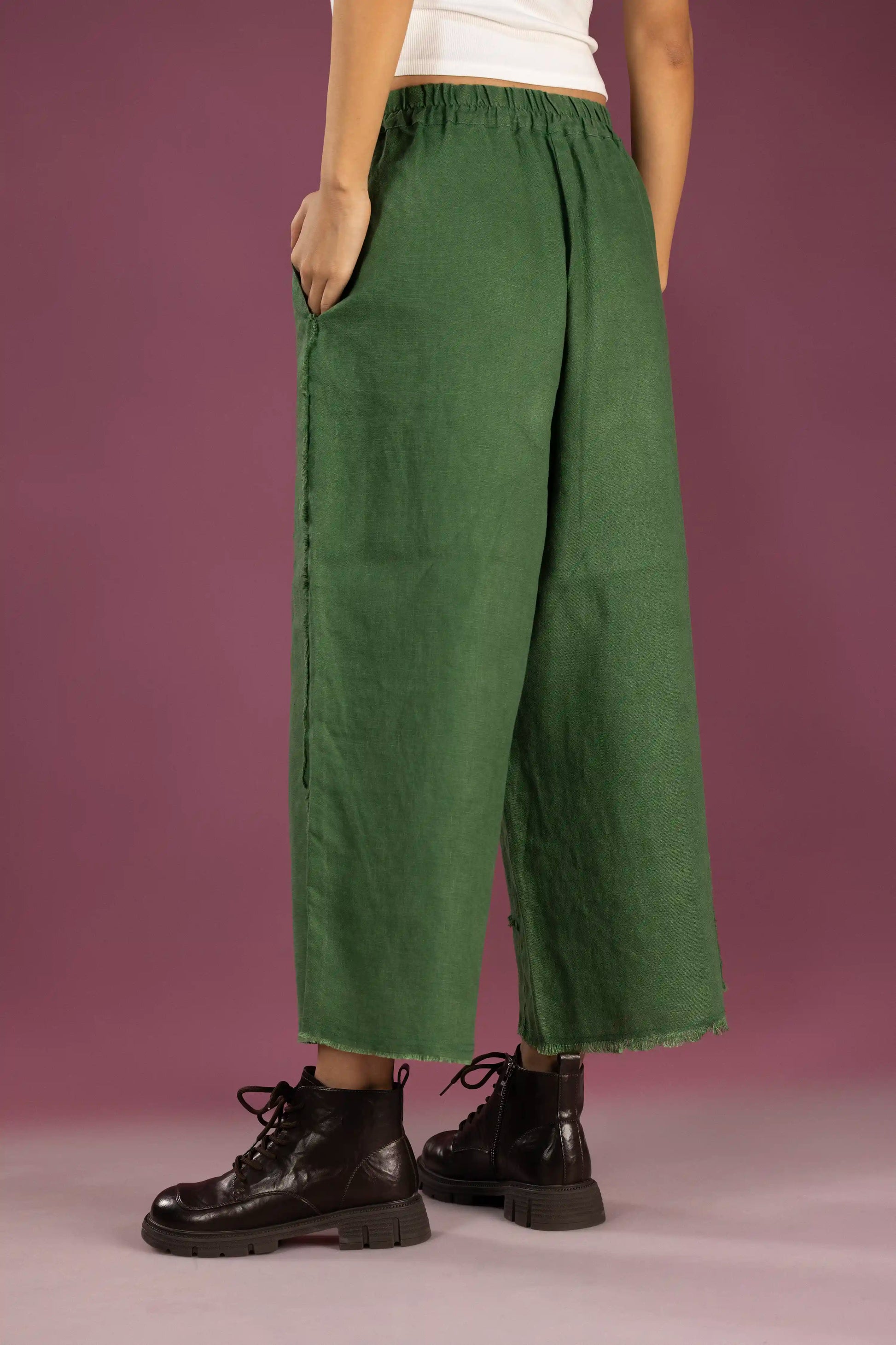 Wide-leg 100% linen pants in deep forest green. Raw seam lines, roomy pockets and an easy elastic waist, quiet drama for everyday wandering.