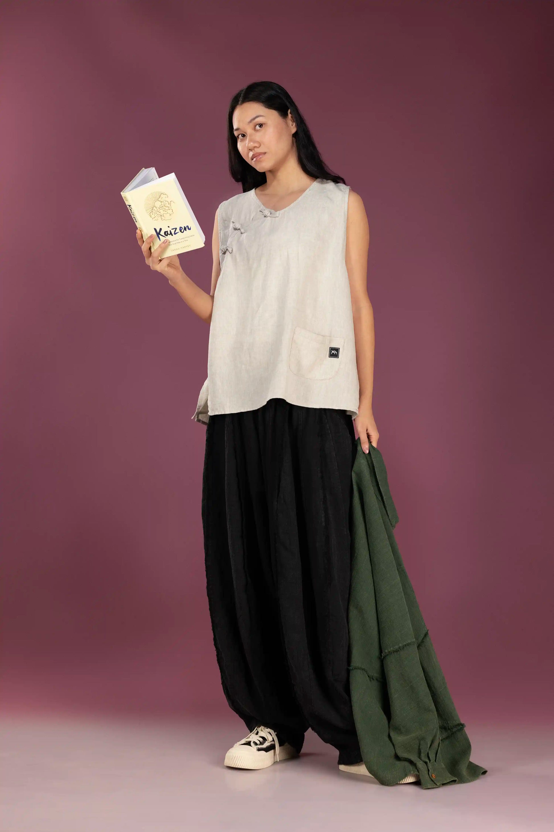 Soft sandwashed linen vest with hand-tied frog knots and roomy pockets, made for easy, artsy layering.