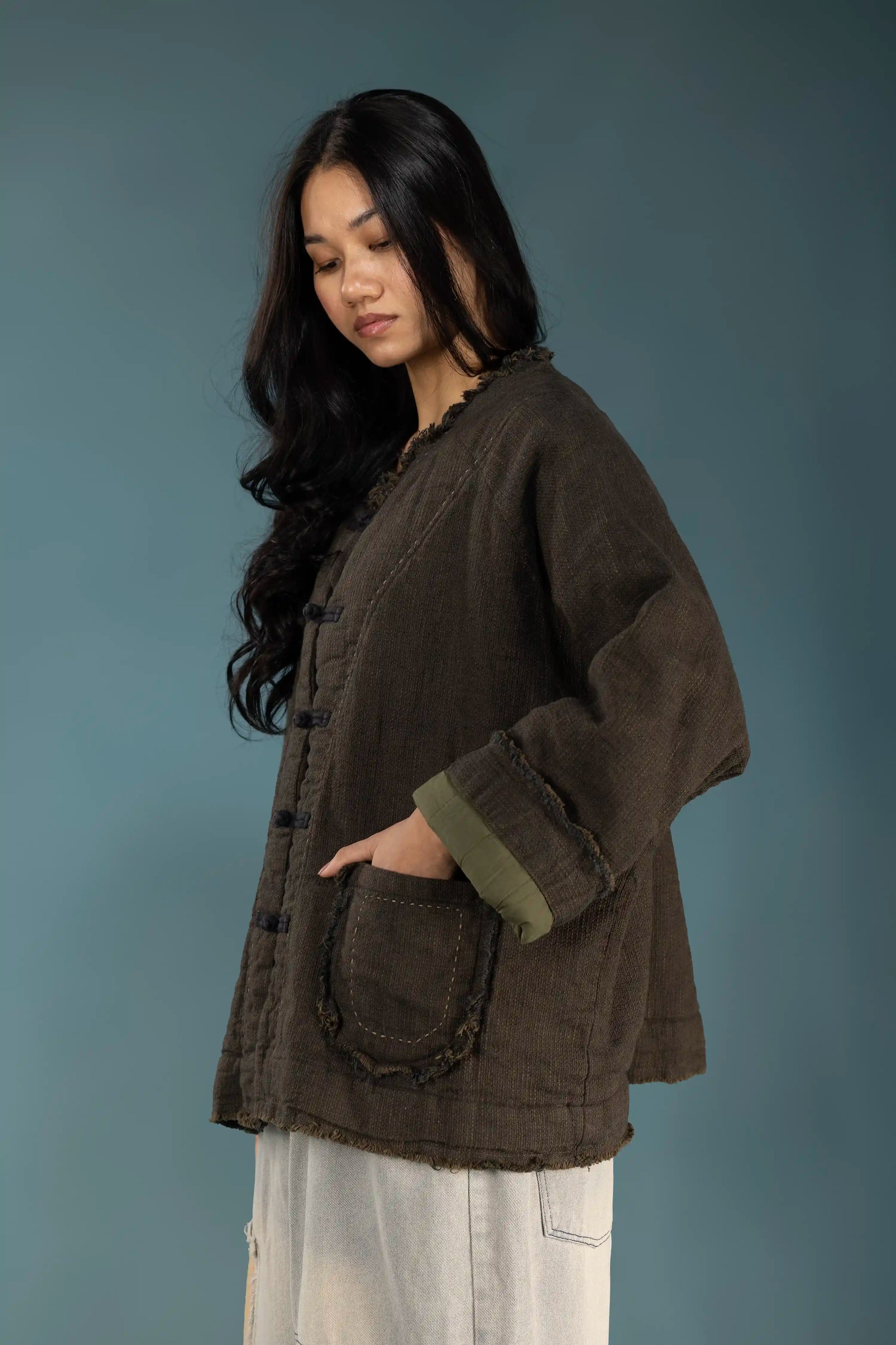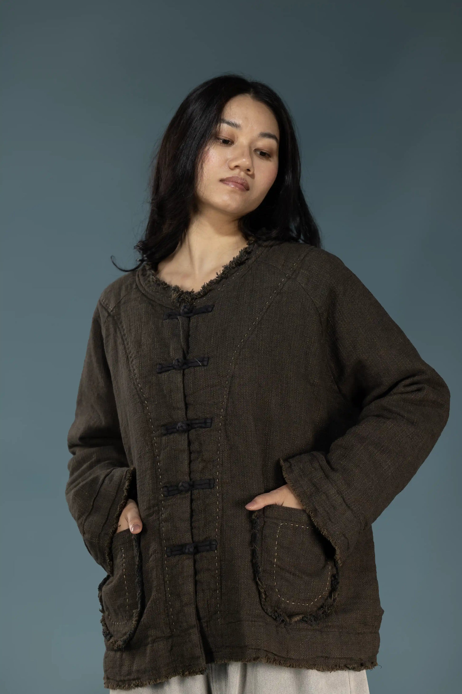 Handcrafted linen jacket with raw edges, frog closures, and subtle padding, an artisanal outer layer with warmth and character.