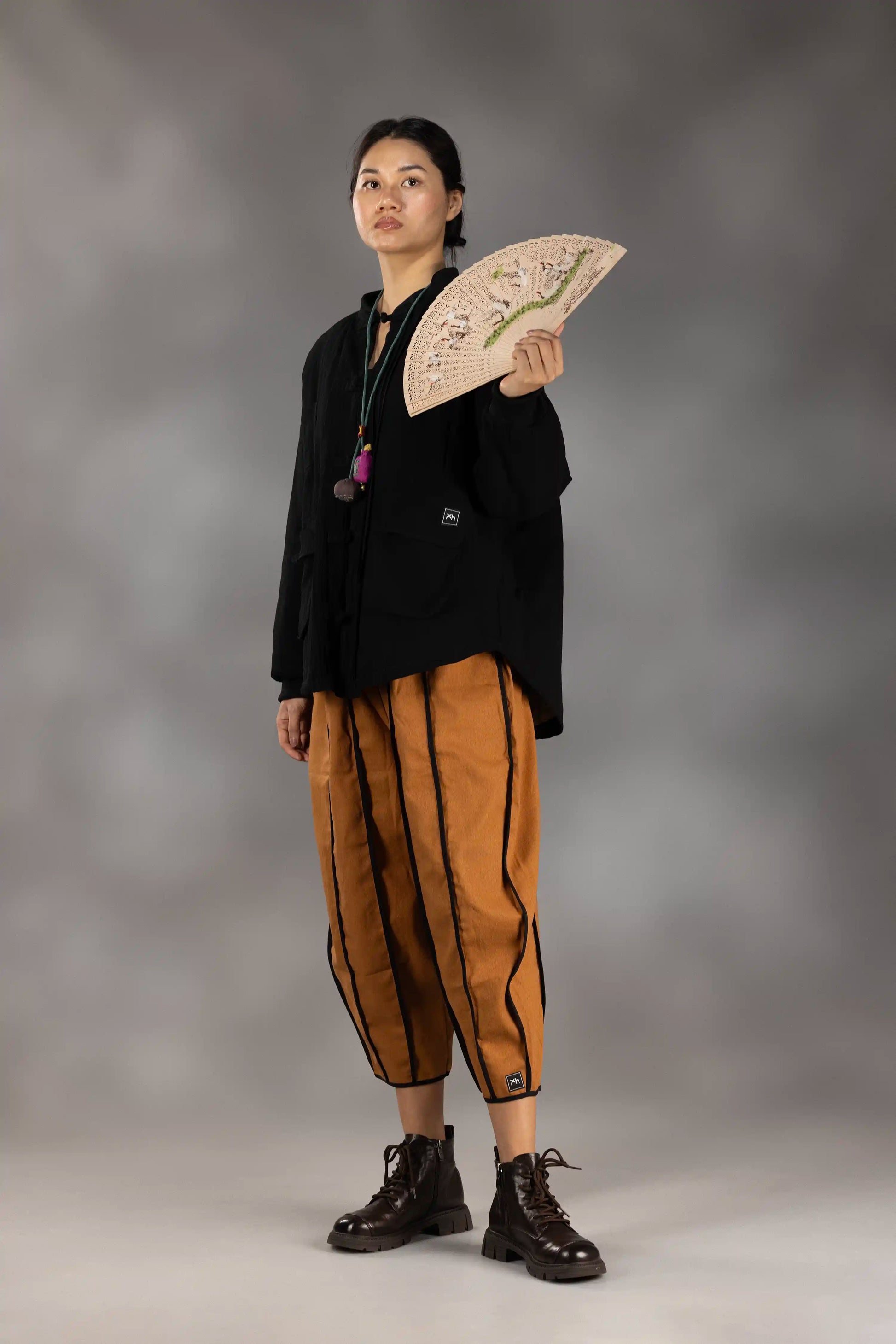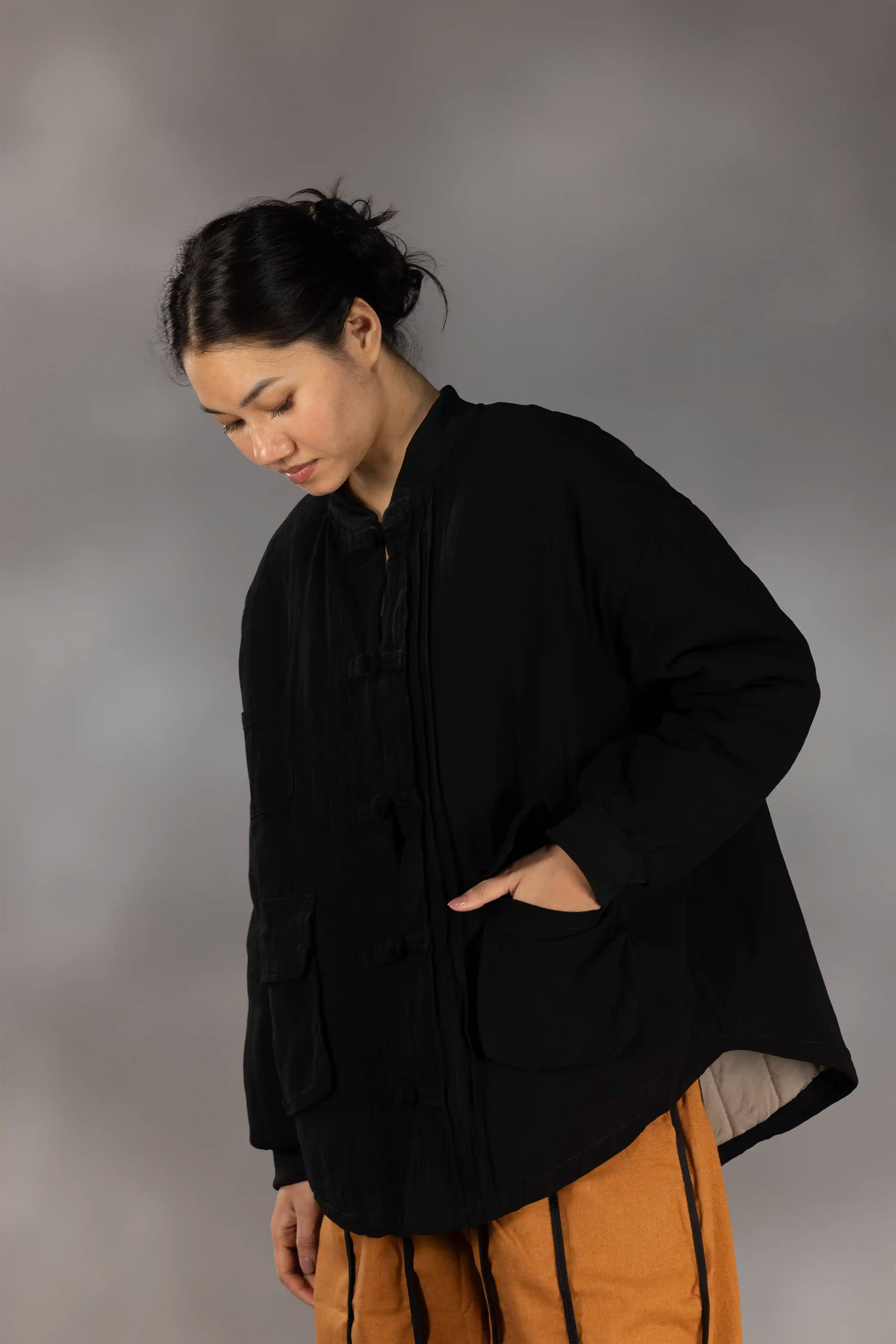 - Mandarin collar and traditional frog-button front.