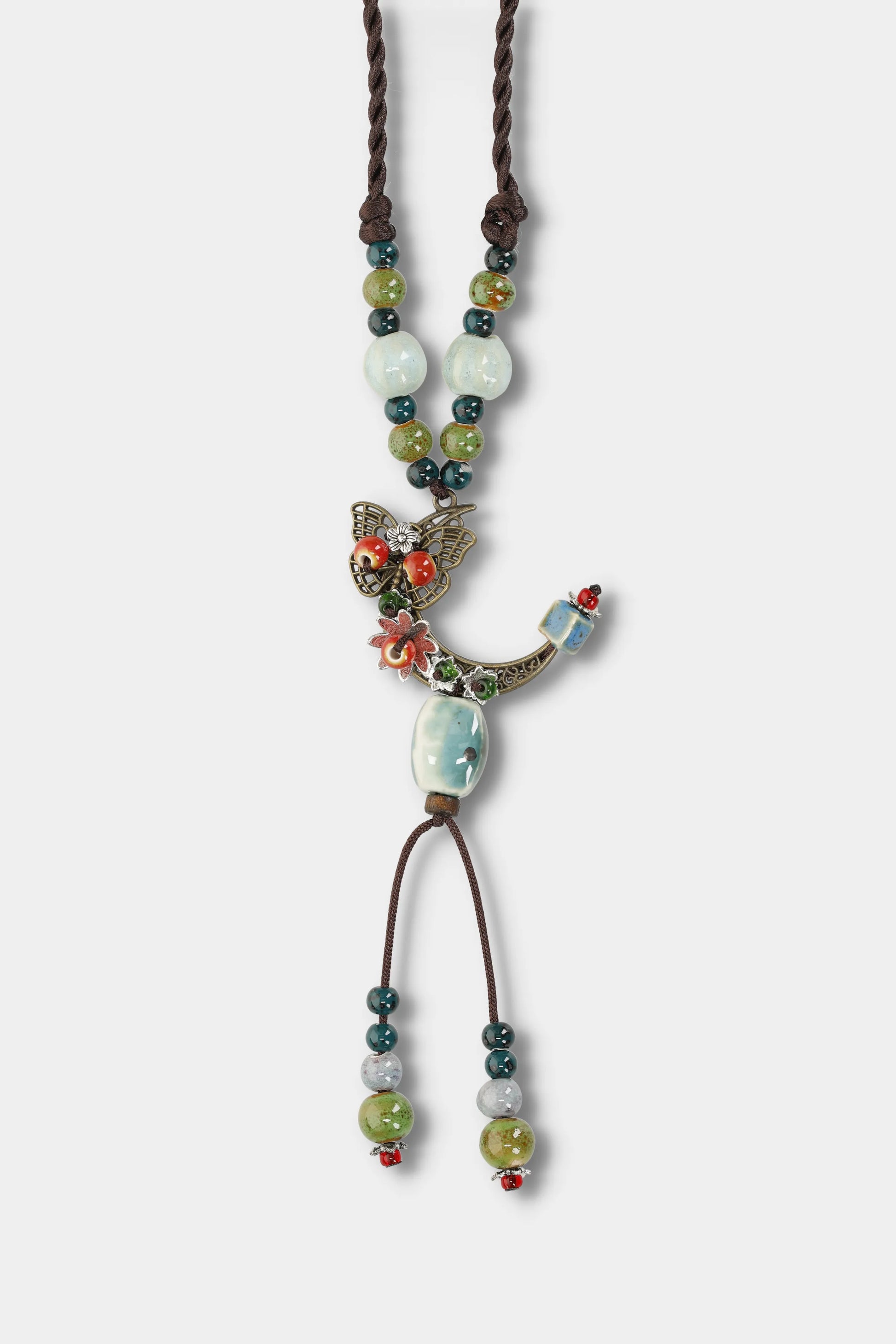 - Hand-strung mix of beads (glass/ceramic) with antiqued alloy crescent charm